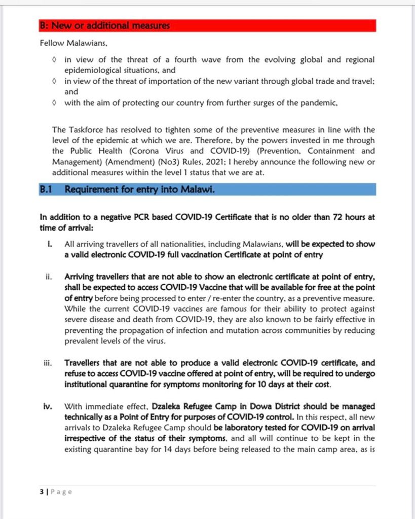 В конце ноября 2021 г. власти Малави объявили об изменениях в правилах въезда в страну. Согласно новым требованиям все въезжающие в страну должны предъявить на пункте въезда электронный сертификат о вакцинации от коронавируса. Эта мера вводится дополнительно к уже существующему требованию иметь при себе сертификат об отрицательном ПЦР тесте, сделанном не ранее 72 часов до прибытия в Малави.